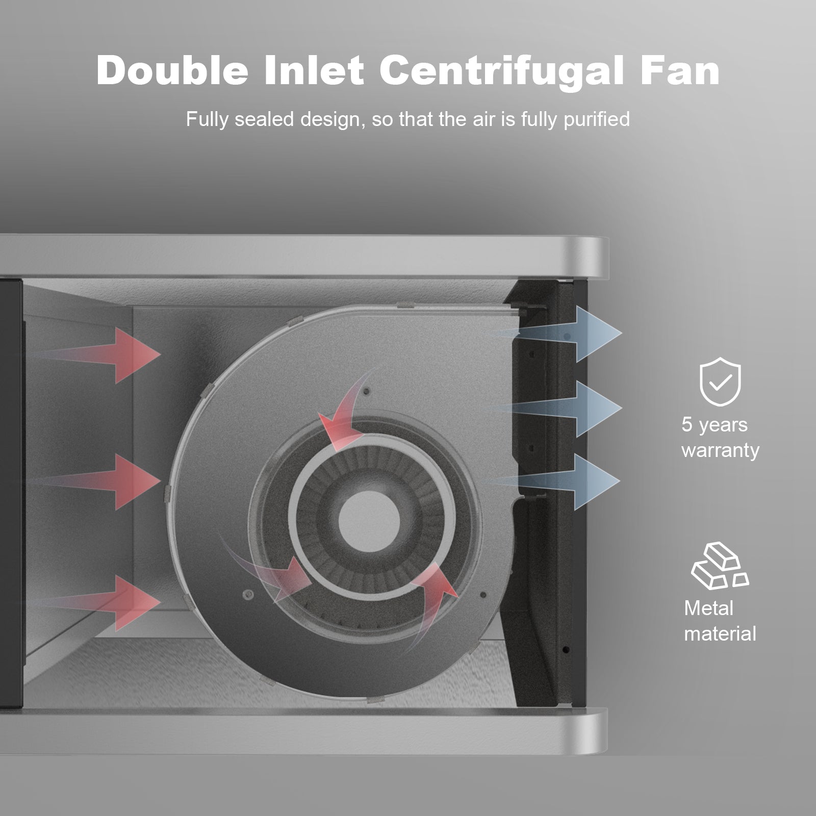 Double air inlet volute type fully sealed fan, so that every particle of air can be fully purified.