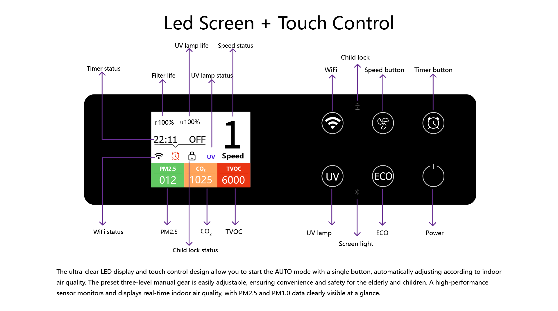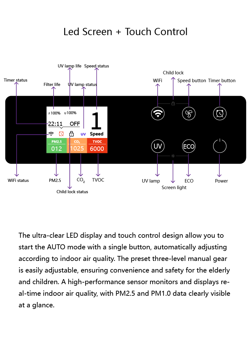- Smart App Control: Remotely control and monitor the air purifier with real-time air quality updates.